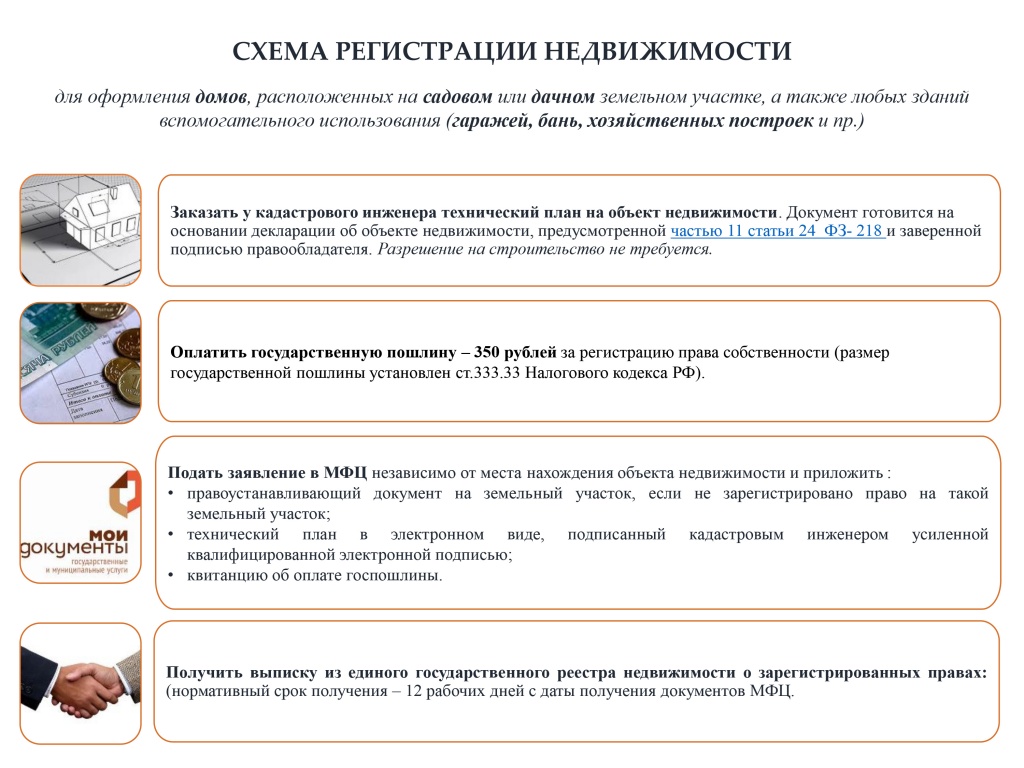 Жилые/садовые дома (бани, гаражи и иные постройки), расположенные вне границ населенных пунктах, в садовых, дачных товариществах (СНТ), на землях для садоводства, дачного строительства. До 01 января 2017 года для регистрации данных объектов необходимо было заполнить декларацию об объекте недвижимого имущества установленного образца, приложить к ней госпошлину и правоустанавливающий документ на земельный участок и подать все это в Росреестр, затем органы Росреестра автоматически сами ставили на кадастровый учет, вы только регистрировали право собственности-иными словами порядок регистрации права собственности на данные объекты был прост, действовал упрощенный порядок. С вступлением в силу Федерального закона №218-ФЗ от 13.07.2015г. "О государственной регистрации недвижимости" для регистрации права собственности такие объекты сначала необходимо поставить на кадастровый учет, а уж затем зарегистрировать право собственности на такие объекты. Основанием для постановки на кадастровый учет вышеуказанных объектов с 01 января 2017г. является технический план, который подготавливается только аттестованными кадастровыми инженерами с обязательным выездом на объект. Как мы видим порядок регистрации права собственности на такие объекты достаточно усложнился.